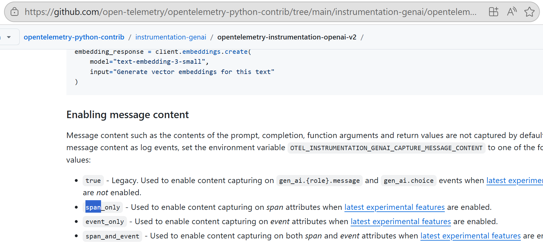 return capture_content.lower() == "true"可我记得在哪里看到过可以使用span_only这样的值啊? 猜测可能是这个目录下的README没有更新吧:opentelemetry-python-contrib/instrumentation-genai/opentelemetry-instrumentation-openai-v2 at main · open-telemetry/opentelemetry-python-contrib